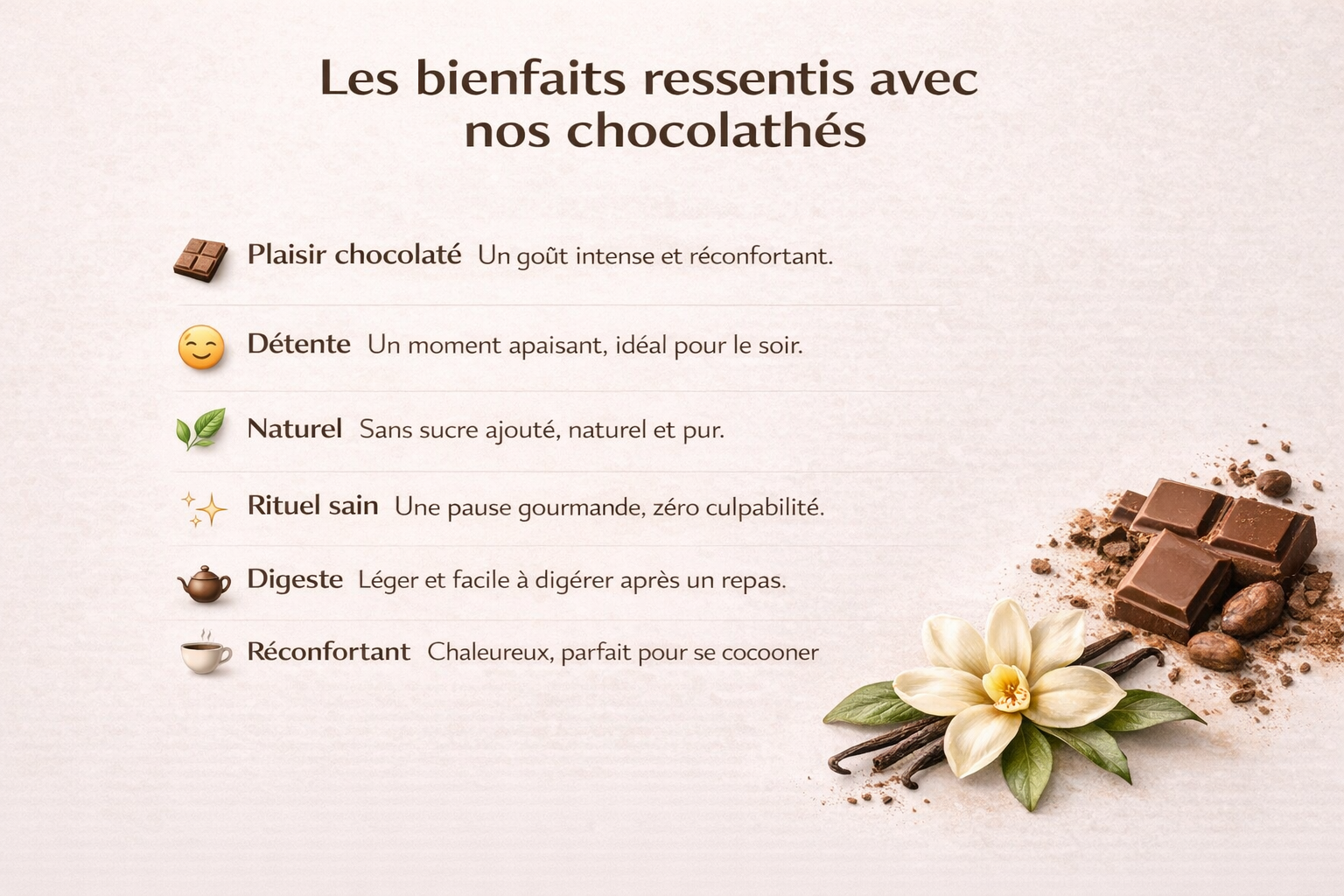 Des chocolathés naturels, élégants et réconfortants.
